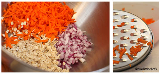 - In a large bowl mix together beef, oats, egg, onion, milk, carrot, bread crumbs, salt, pepper, and Worcestershire.